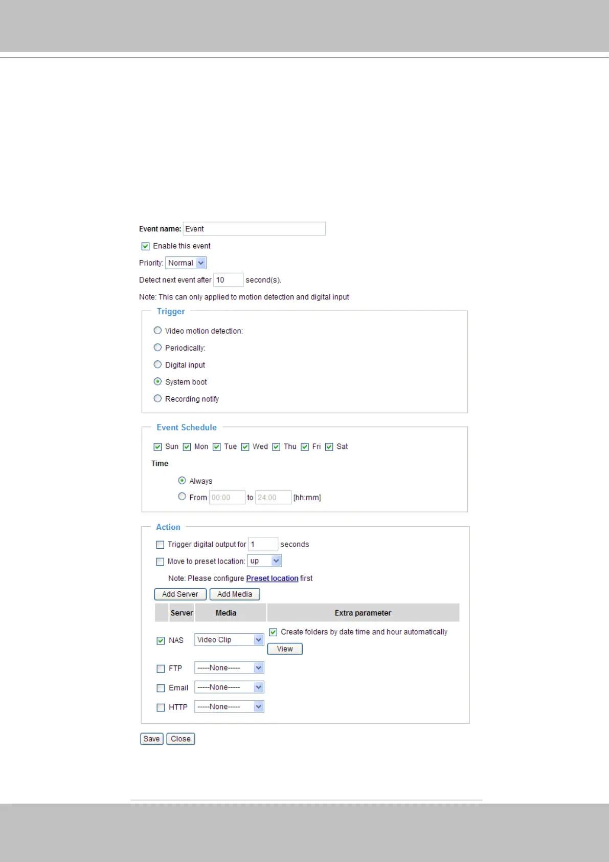 To plot an event with recorded video or snapshots, it is necessary to congure the server and