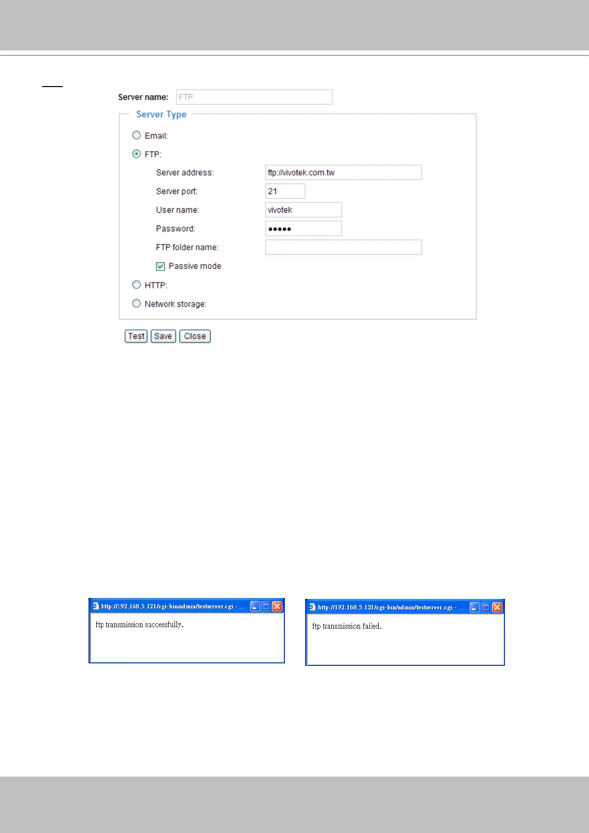 To verify if the FTP settings are correctly congured, click Test� The result will be shown in a pop-up
