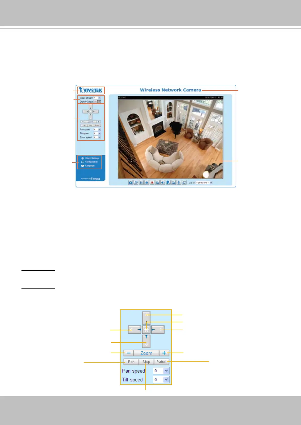 VIVOTEK INC. Logo, Host Name, Camera Control Area, PTZ Control Panel, Conguration Area,
