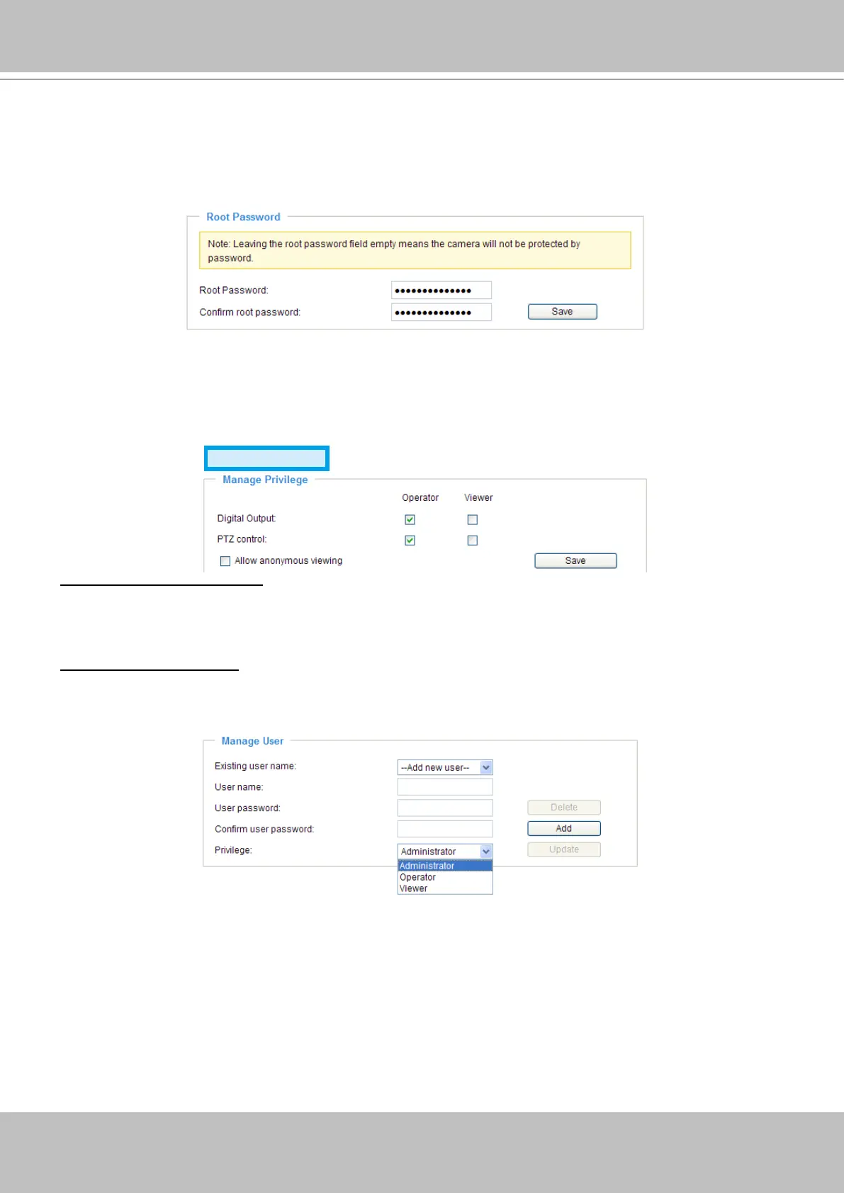 Digital Output & PTZ control: You can modify the manage privilege of operators or viewers� Check or