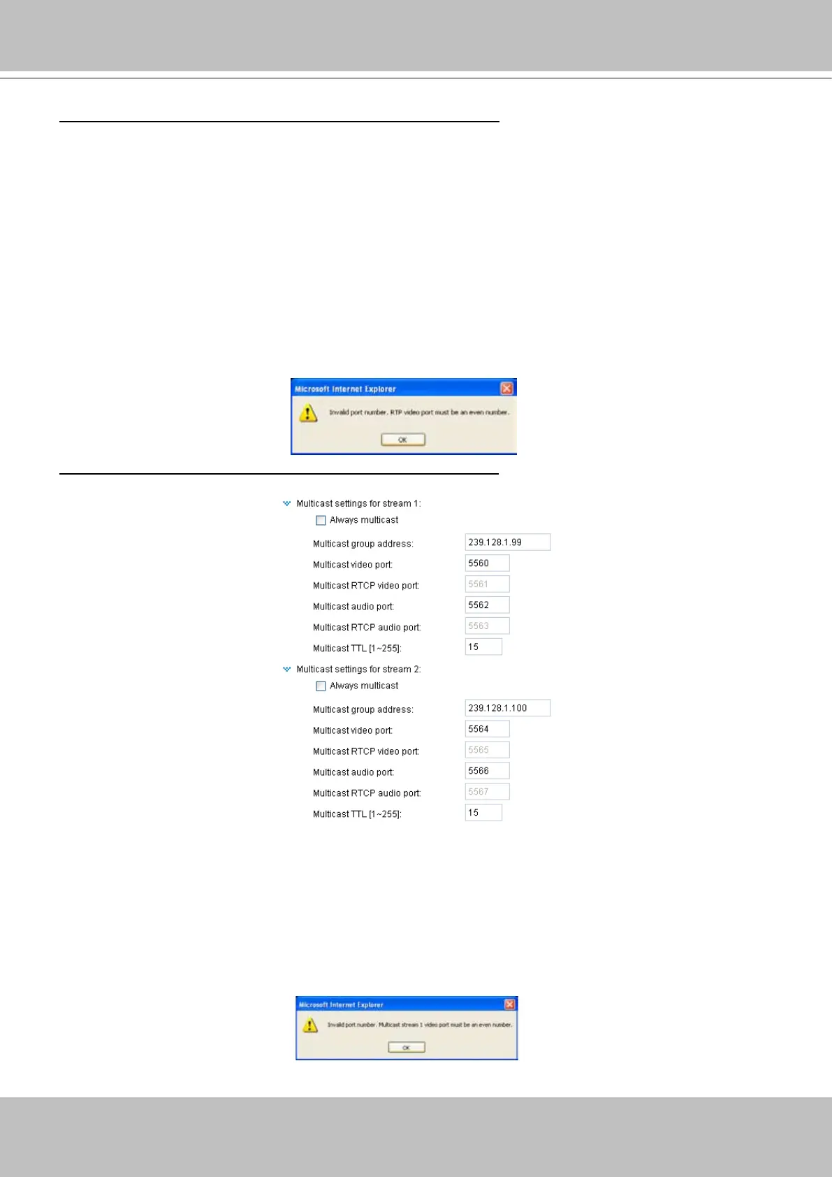 If the multicast RTP video ports are incorrectly assigned, the following warning message will be
