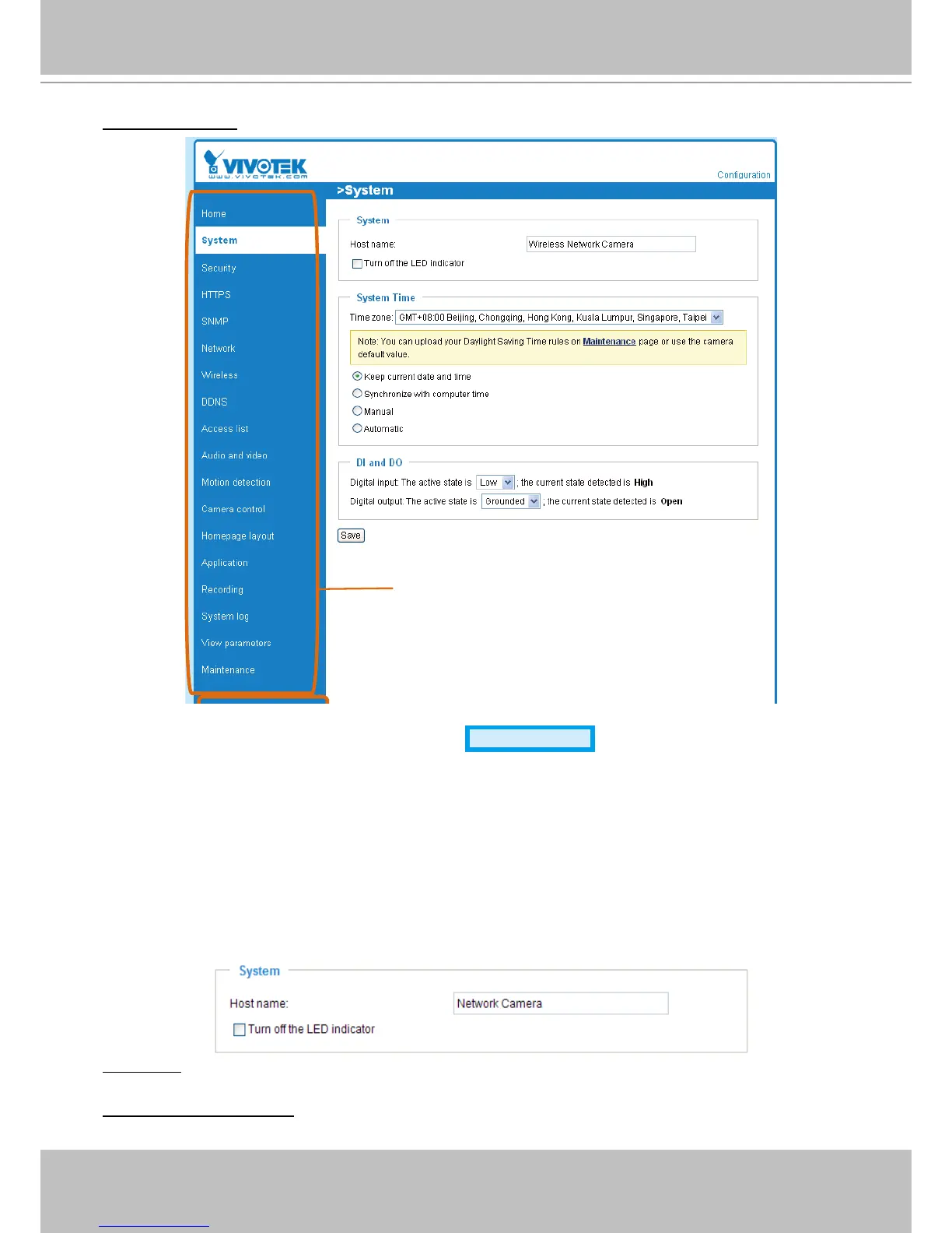 System, System Time, and DI/DO� When completed with the settings on this page, click Save at