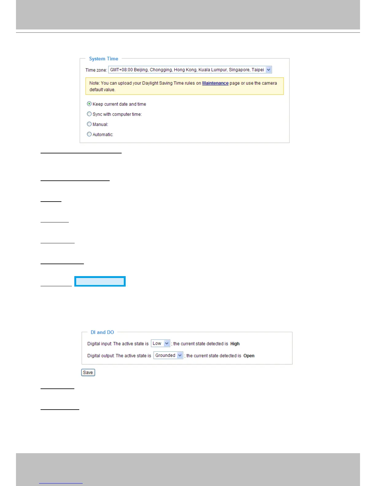 Digital input: Select High or Low to dene the normal status for the digital input. The Network Camera