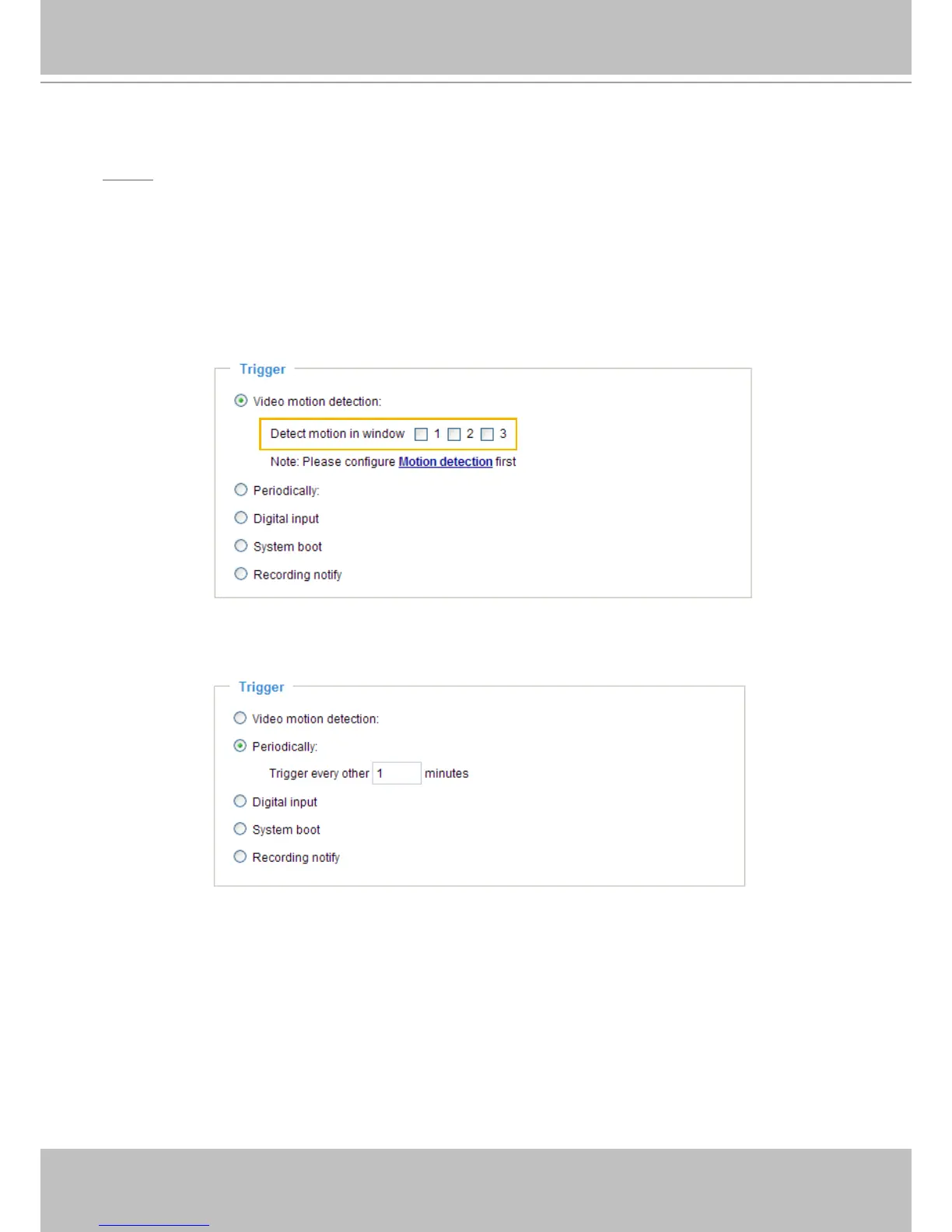 This option allows the Network Camera to trigger periodically for every other dened minute. Up to 999