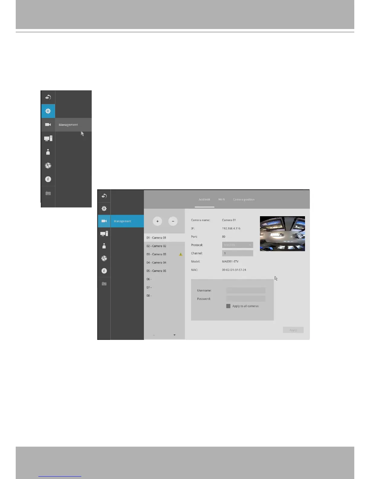 2. Assign User name and Password, or apply the credentials to all cameras in