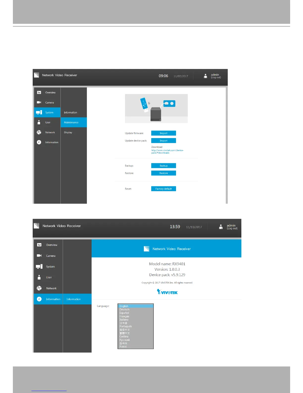 Enter the Information page to change the language used on the conguration interface.
