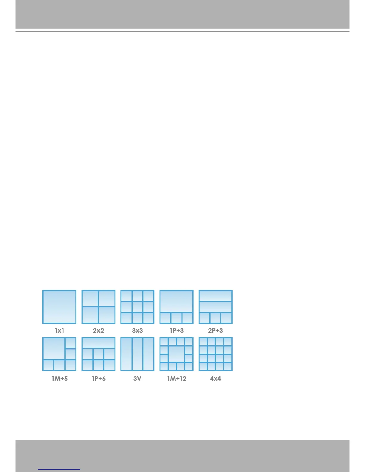 The RX9401 provides various split modes for layout display (1x1, 2x2, 3x3, 1P+3, 2P+3, 1M+5,