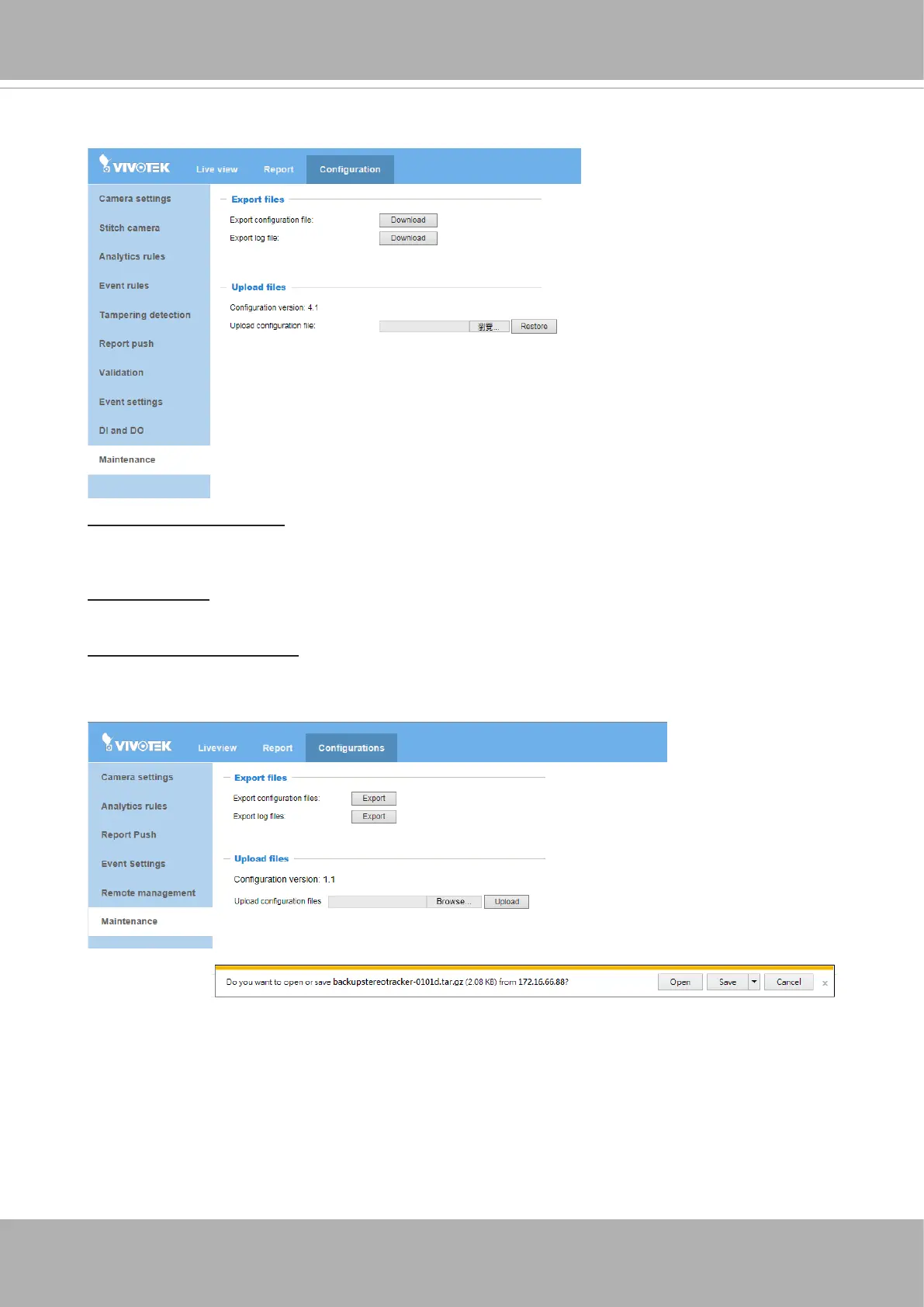 Export conguration le: Use this to export your current camera conguration. Use this to