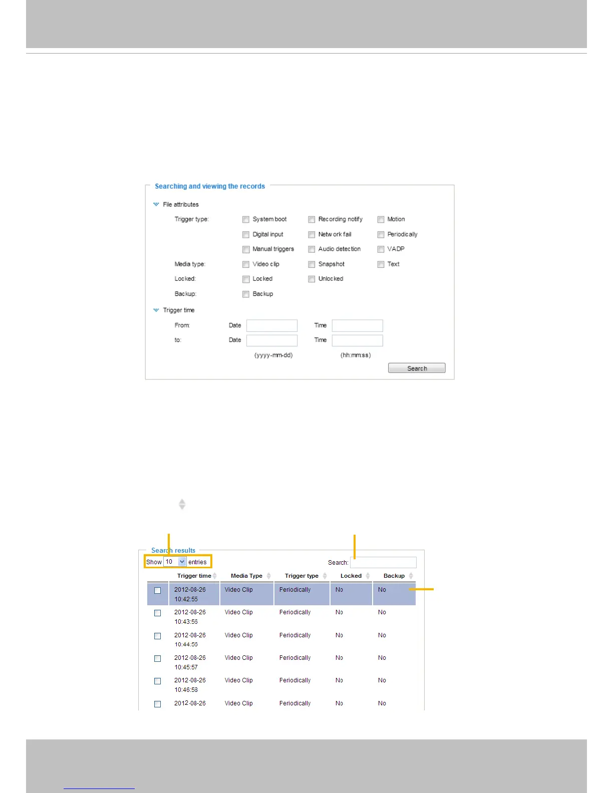 The following is an example of search results. There are four columns: Trigger time, Media type, Trigger