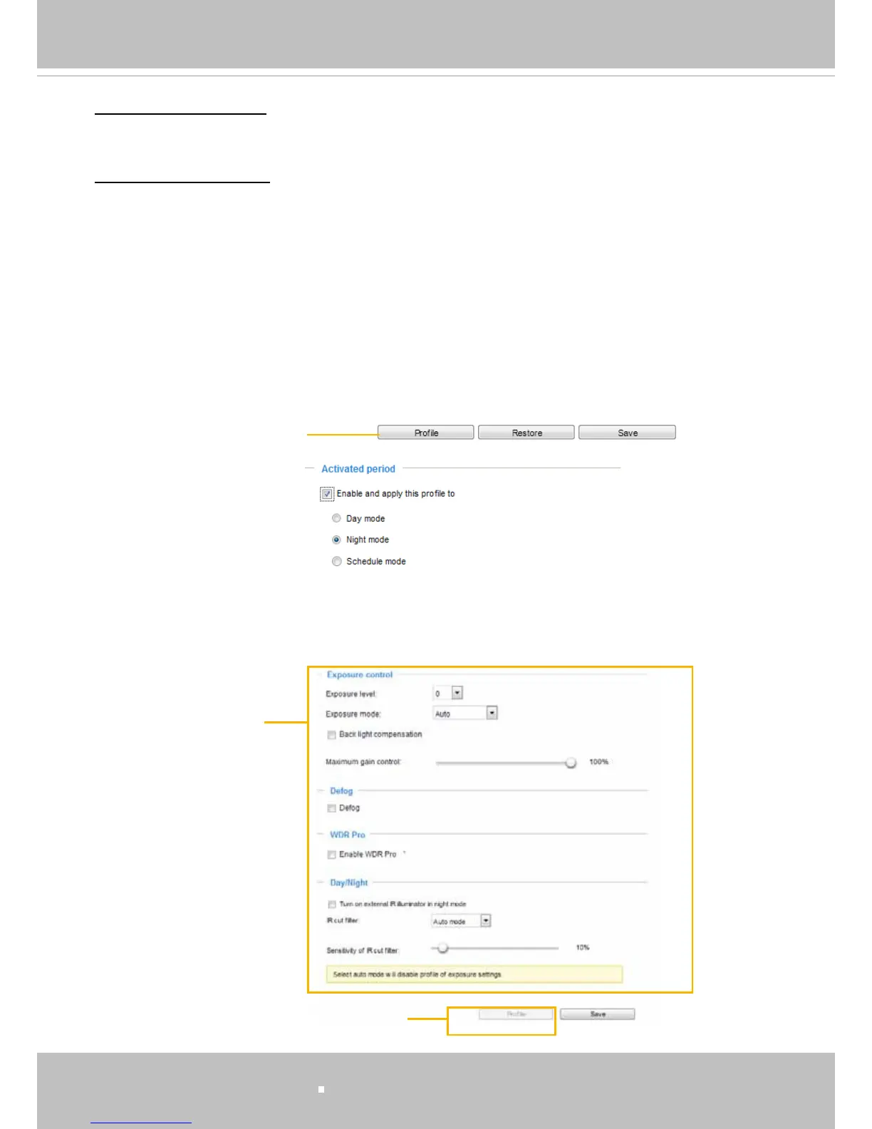 On this page, you can set the Exposure level, Max gain,Exposure mode, and IR cut lter related settings.