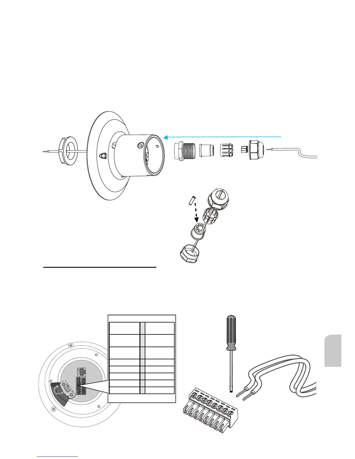 провода ввода-вывода через водозащитный соединитель (E --> D --> B --> A), как показано