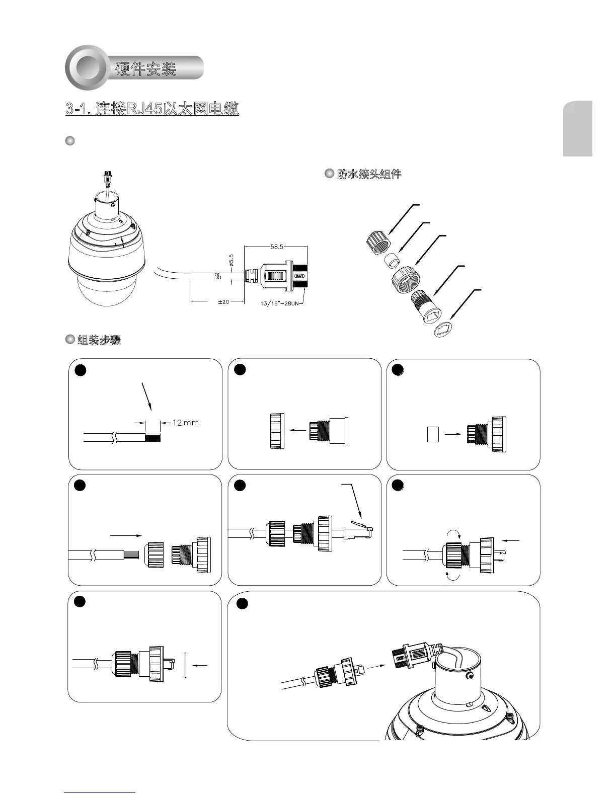 连接乙太网路缆线与RJ45缆线,并将接头锁紧。
