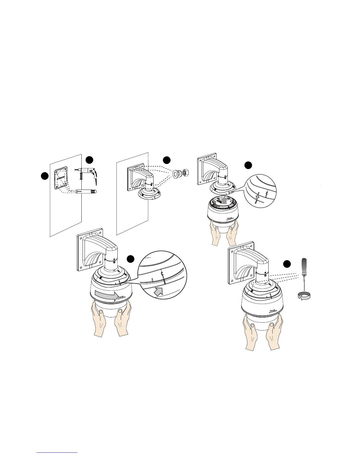 3. 4組の脱落防止ワッシャおよびナットを使用して、壁取付けブラケットを壁に固定します。
