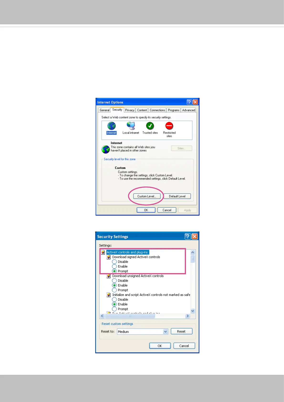 ► If you see a dialog box indicating that your security settings prohibit running ActiveX