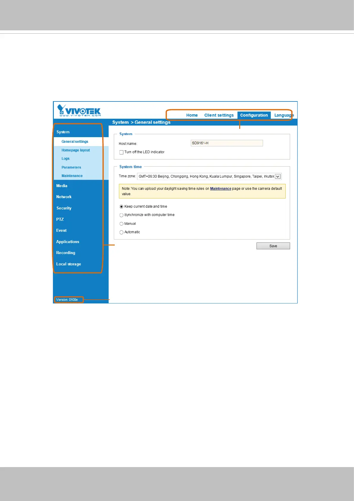 Click Configuration on the main page to enter the camera setting pages. Note that only