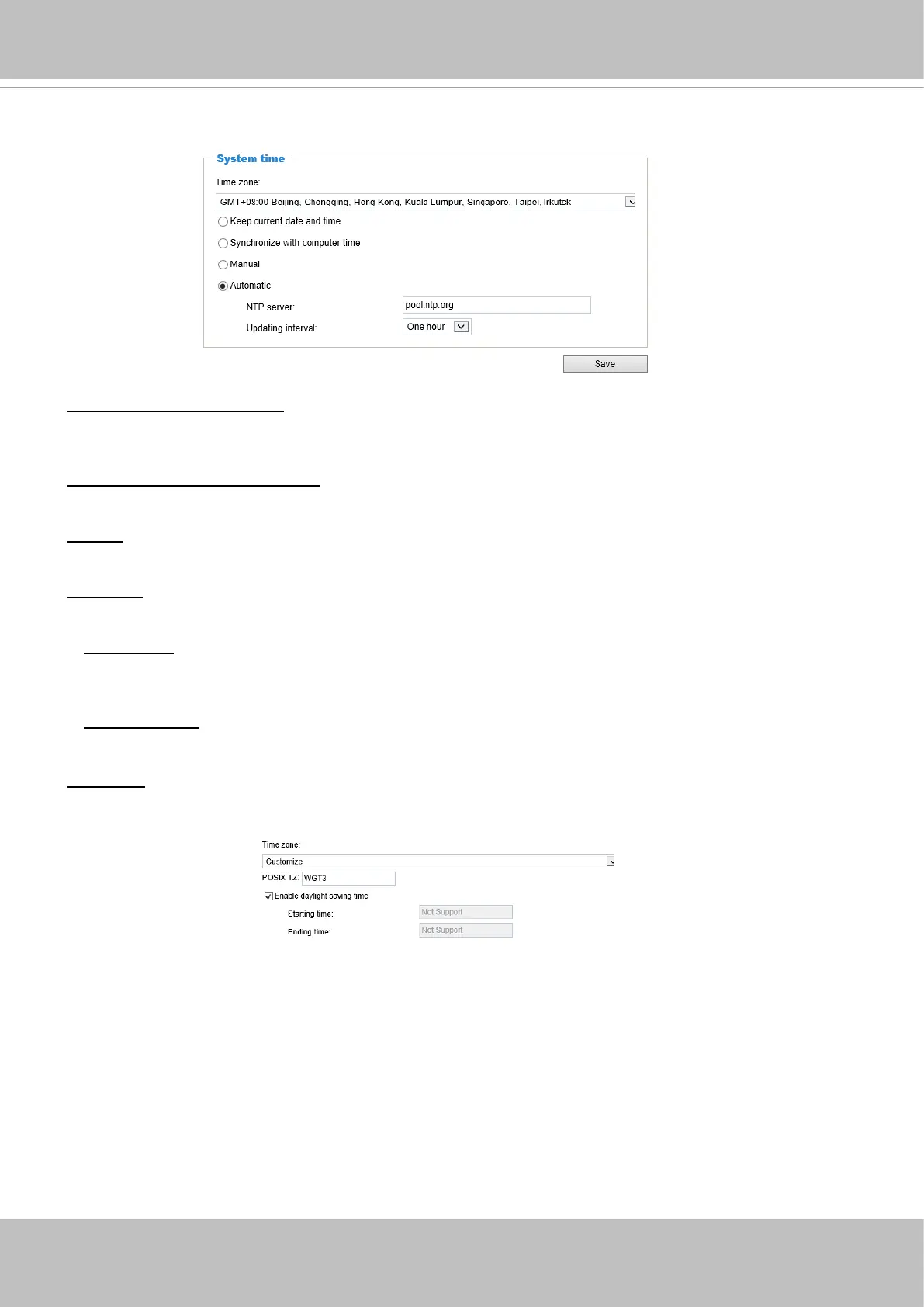 NTP server: Assign the IP address or domain name of the time-server. Leaving the text box blank