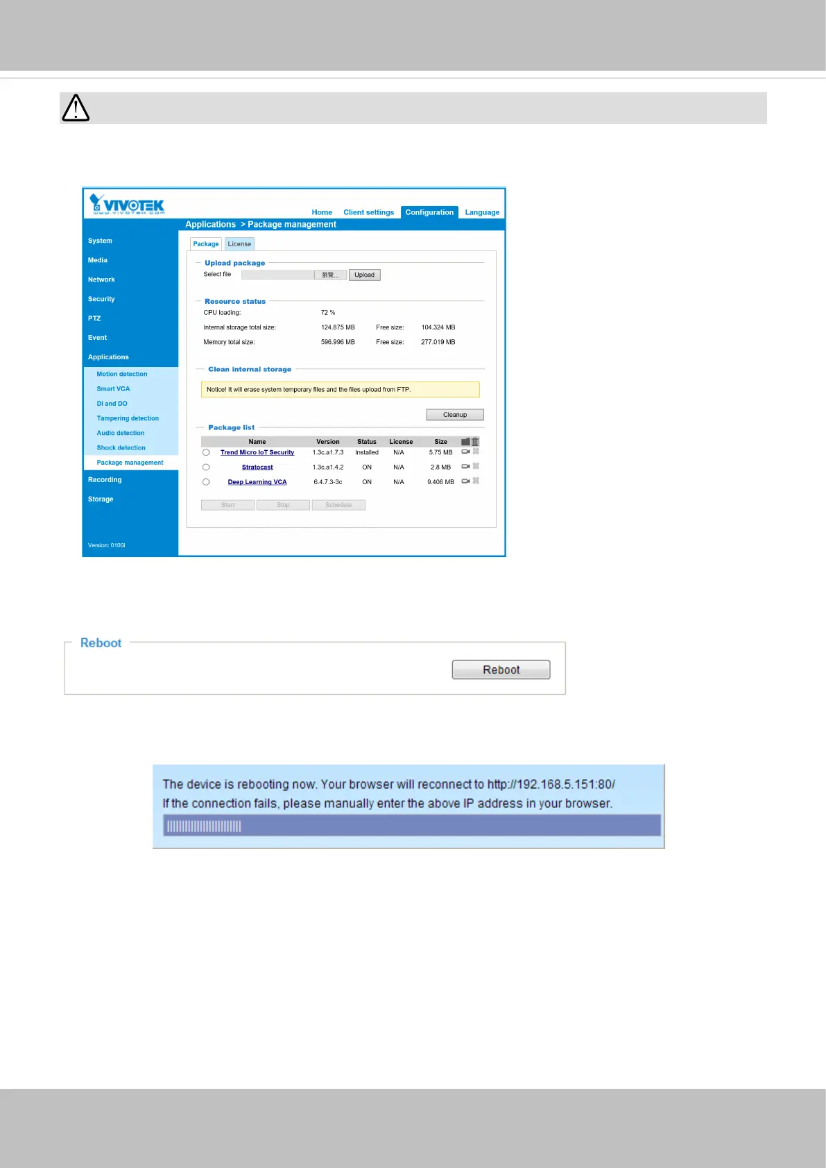 This feature allows you to reboot the Network Camera, which takes about one minute to complete.