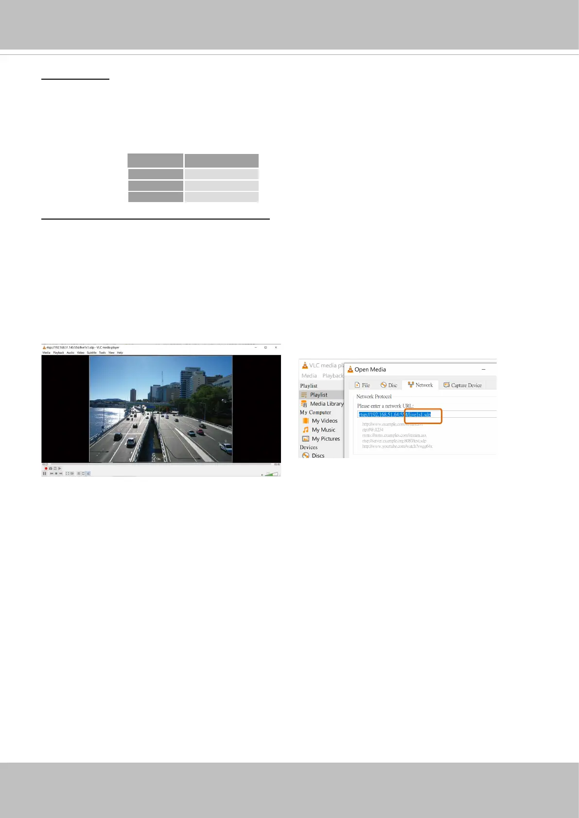H.265 or 264 and use the following RTSP URL command to request transmission of the streaming data.