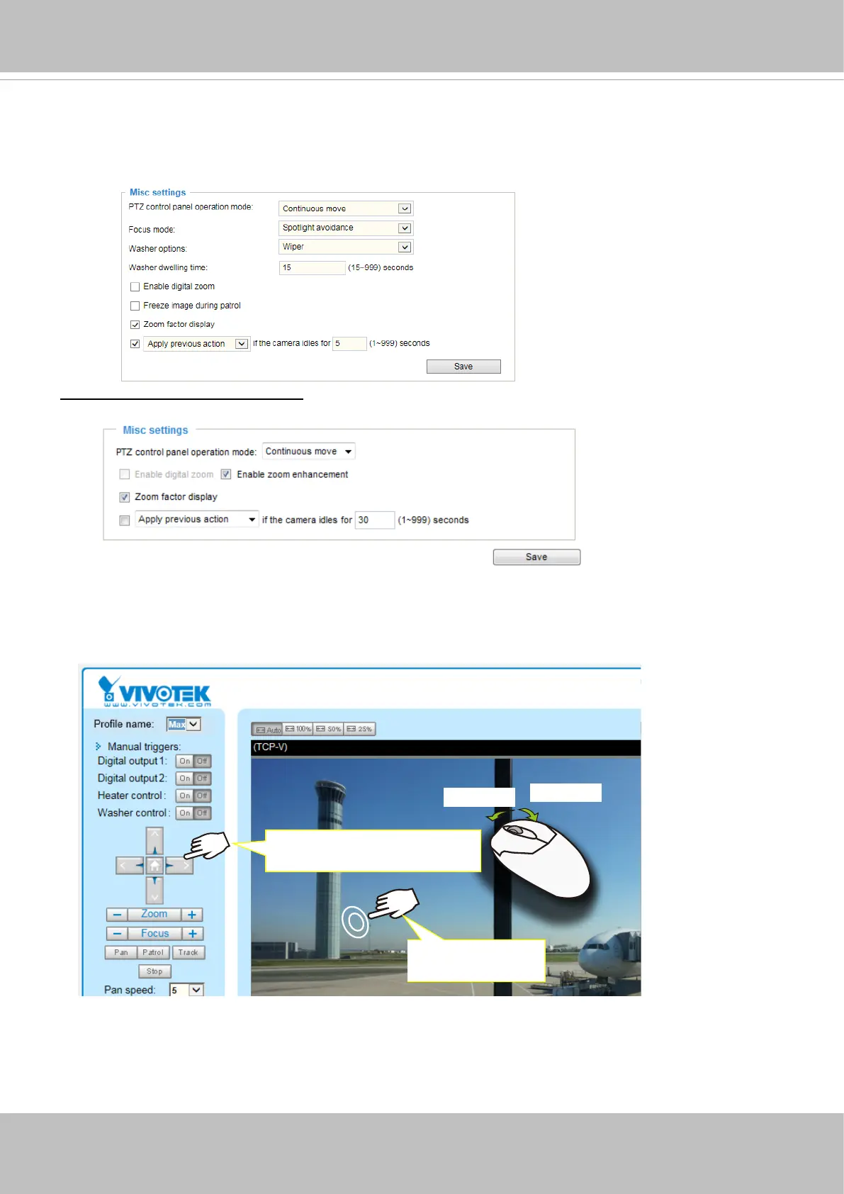 Zoom, and Focus buttons on the PTZ panel. If you select Click to move, every single mouse click takes