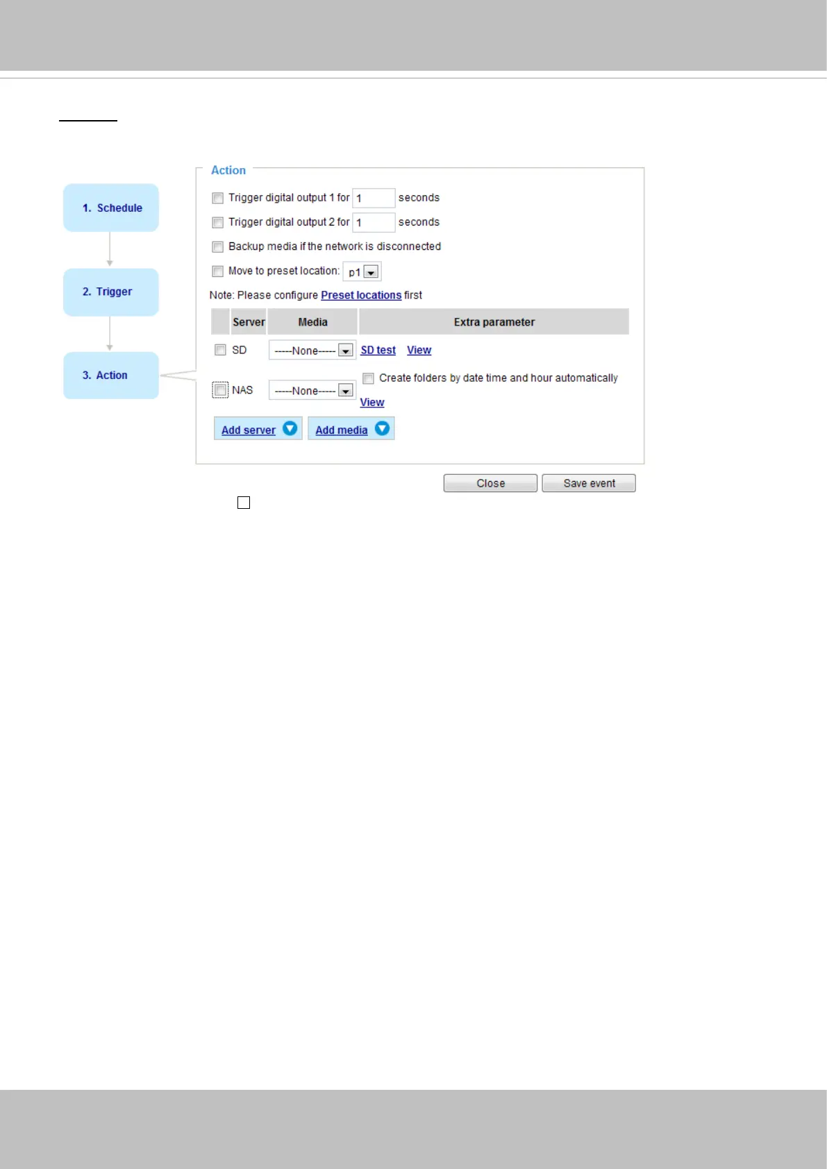 Dene the actions to be performed by the Network Camera when a trigger is activated.