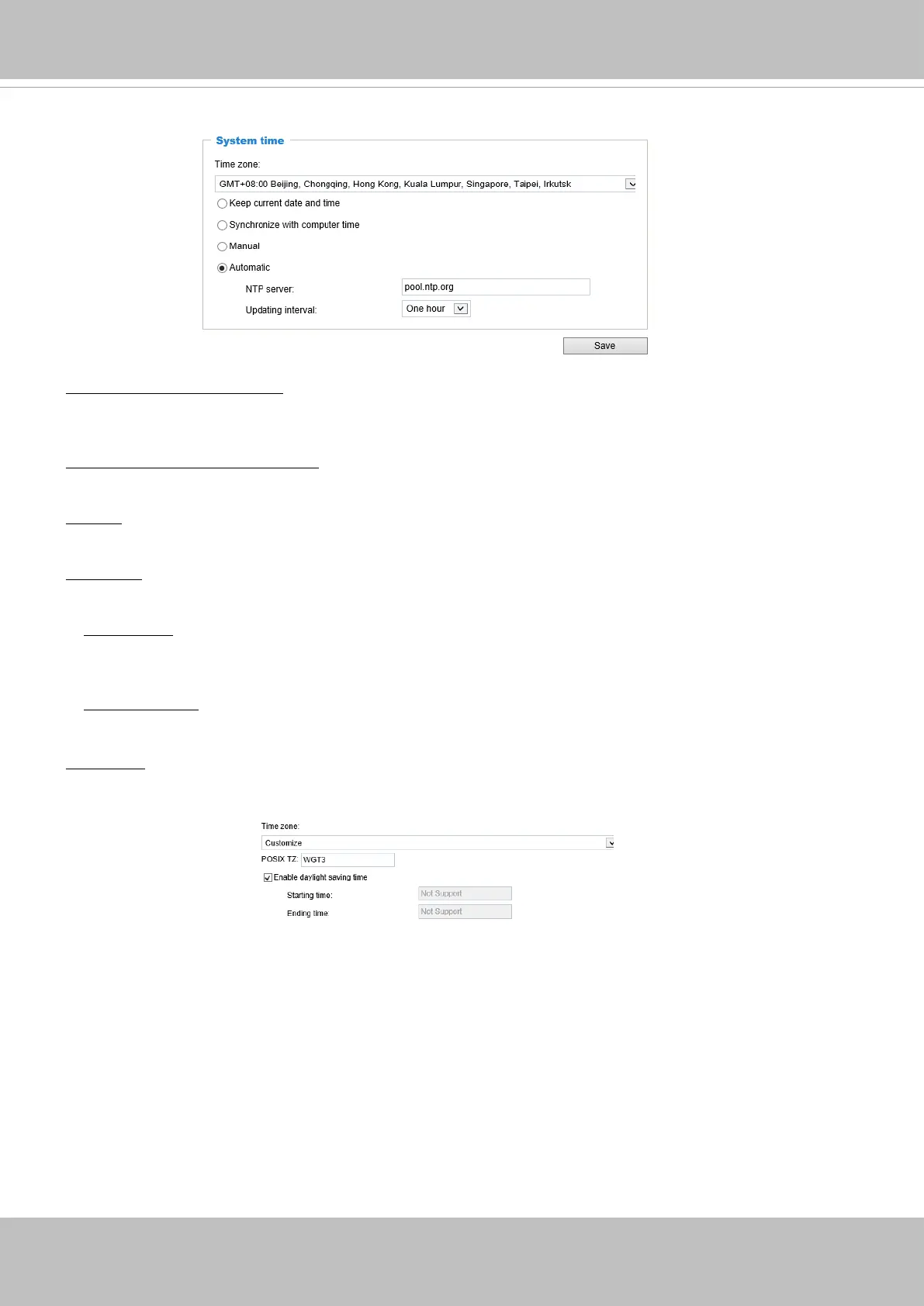 NTP server: Assign the IP address or domain name of the time-server. Leaving the text box blank