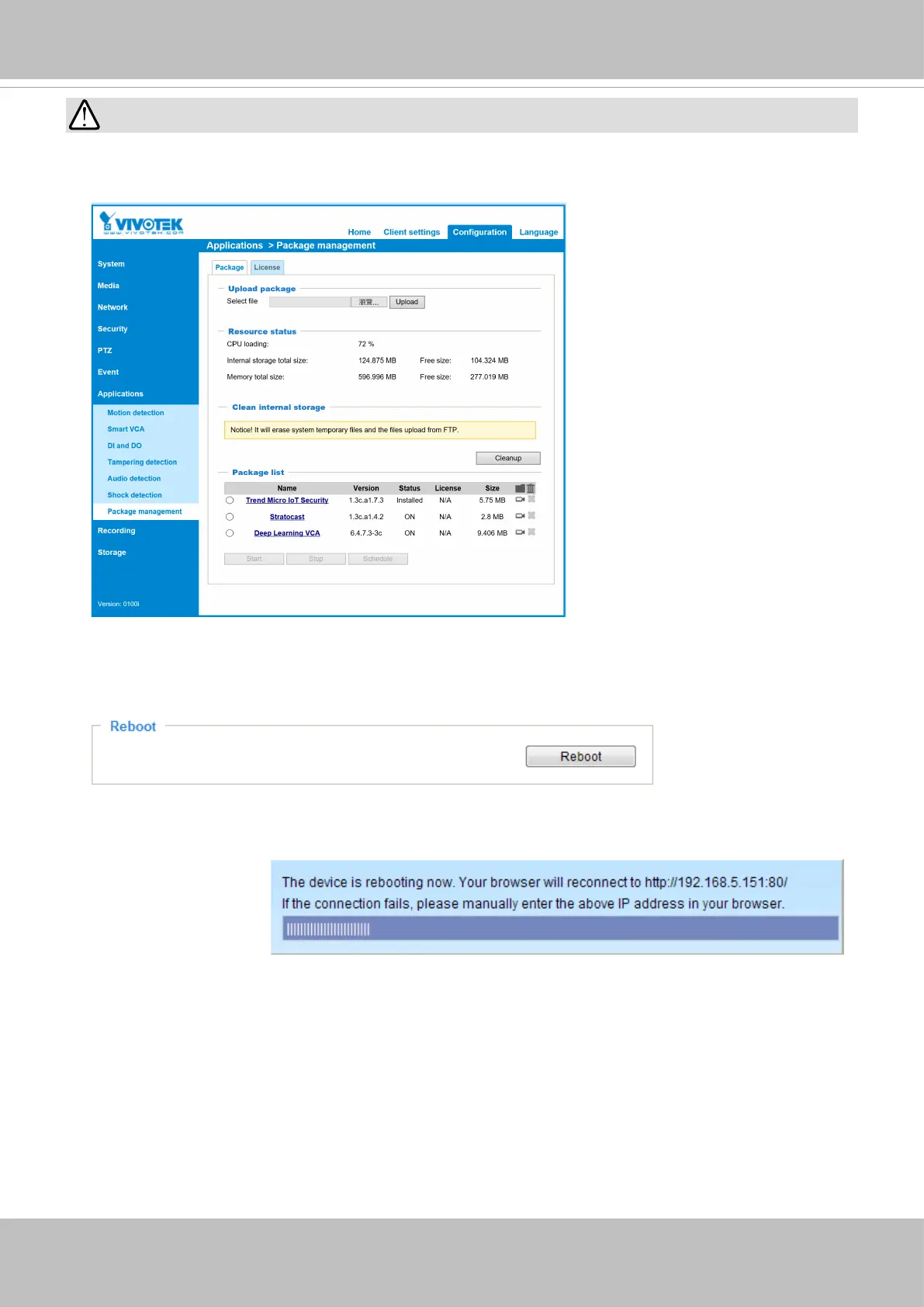This feature allows you to reboot the Network Camera, which takes about one minute to complete. When