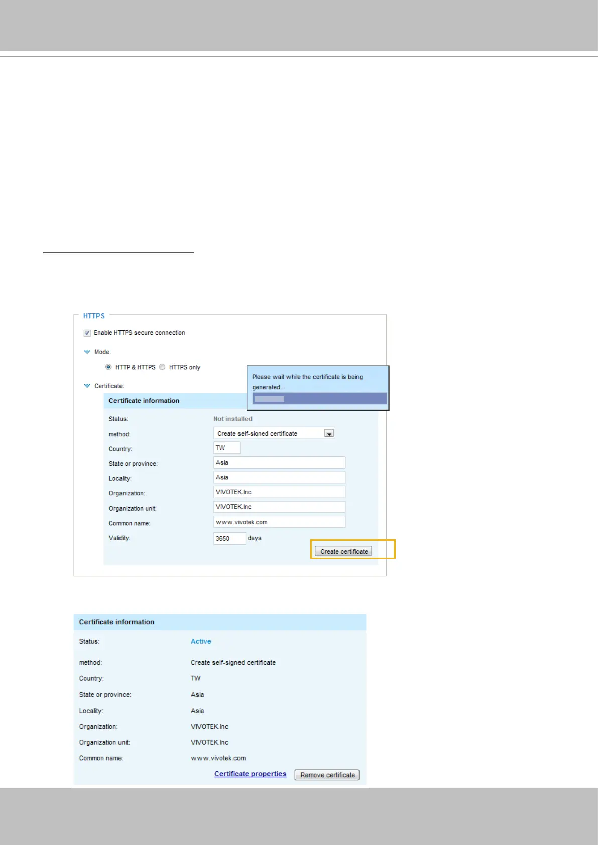 Before using HTTPS for communication with the Network Camera, a Certicate must be created rst.