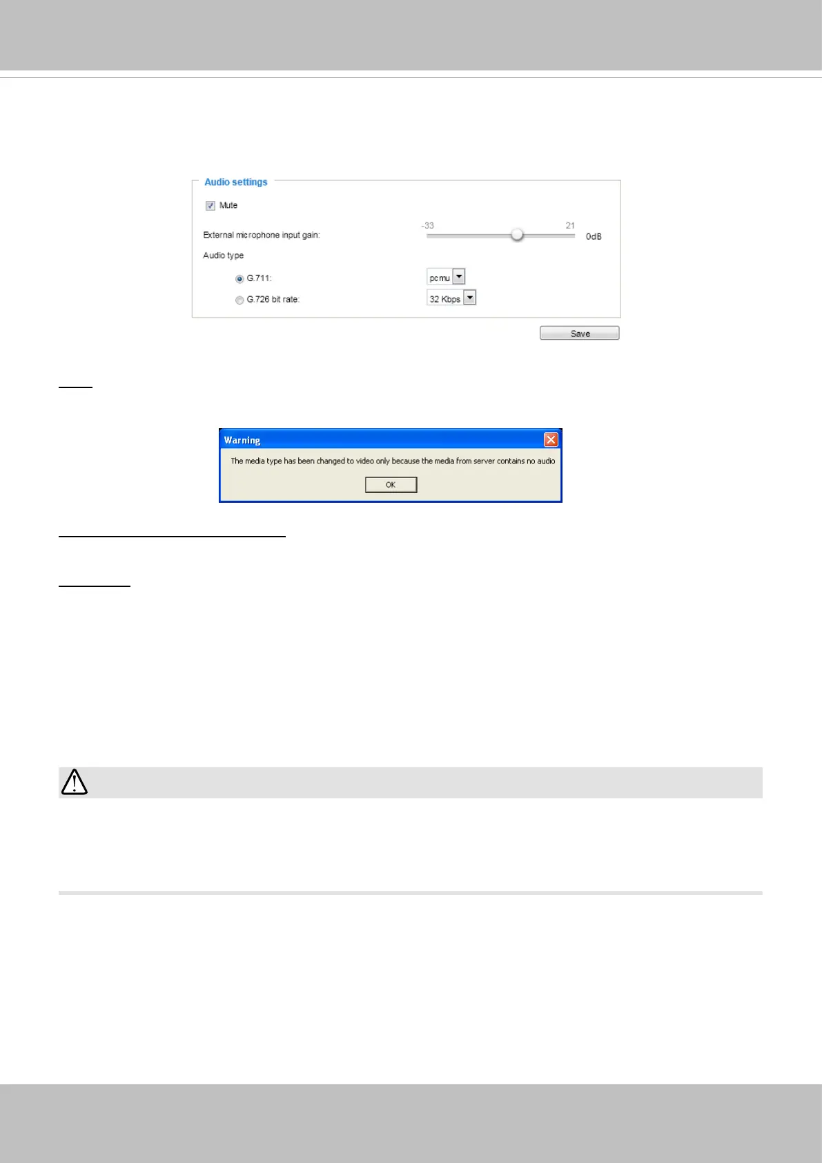 Mute: Select this option to disable audio transmission from the Network Camera to all clients. Note that