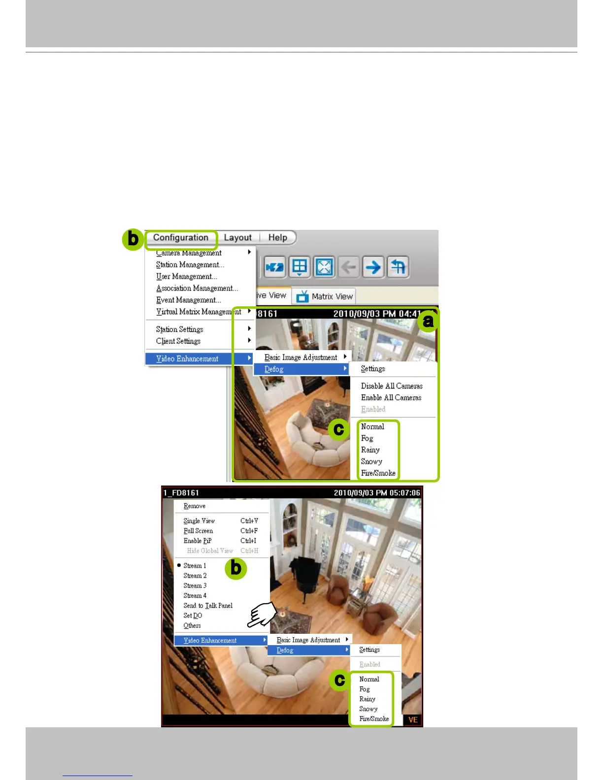 b. Click Conguration > Video Enhancement > Defog or