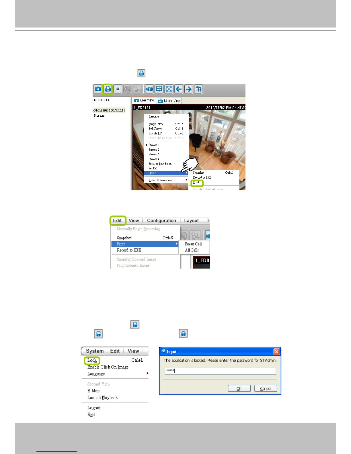 To lock LiveClient, click Unlock on the quick access bar or click System > Lock on the system