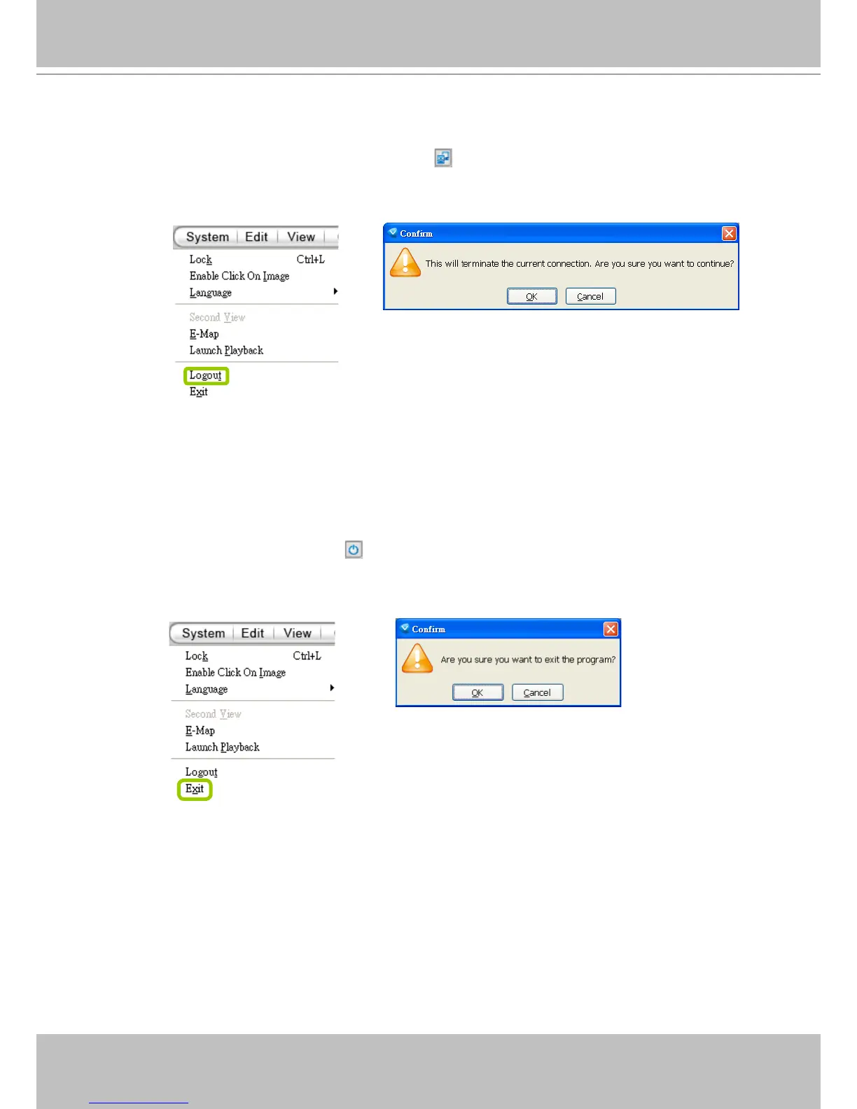 Logout on the menu bar. A conrmation window will pop up. Click OK to conrm or Cancel to