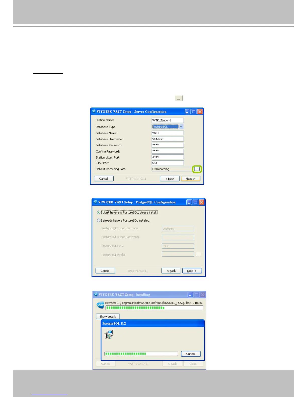 a. Select PostgreSQL from the drop-down list and assign a password. VAST server will by default store
