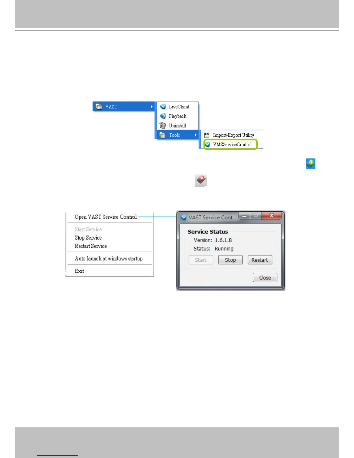 VAST service control tool is a tool for server control and for user to be aware of the VAST Server status.