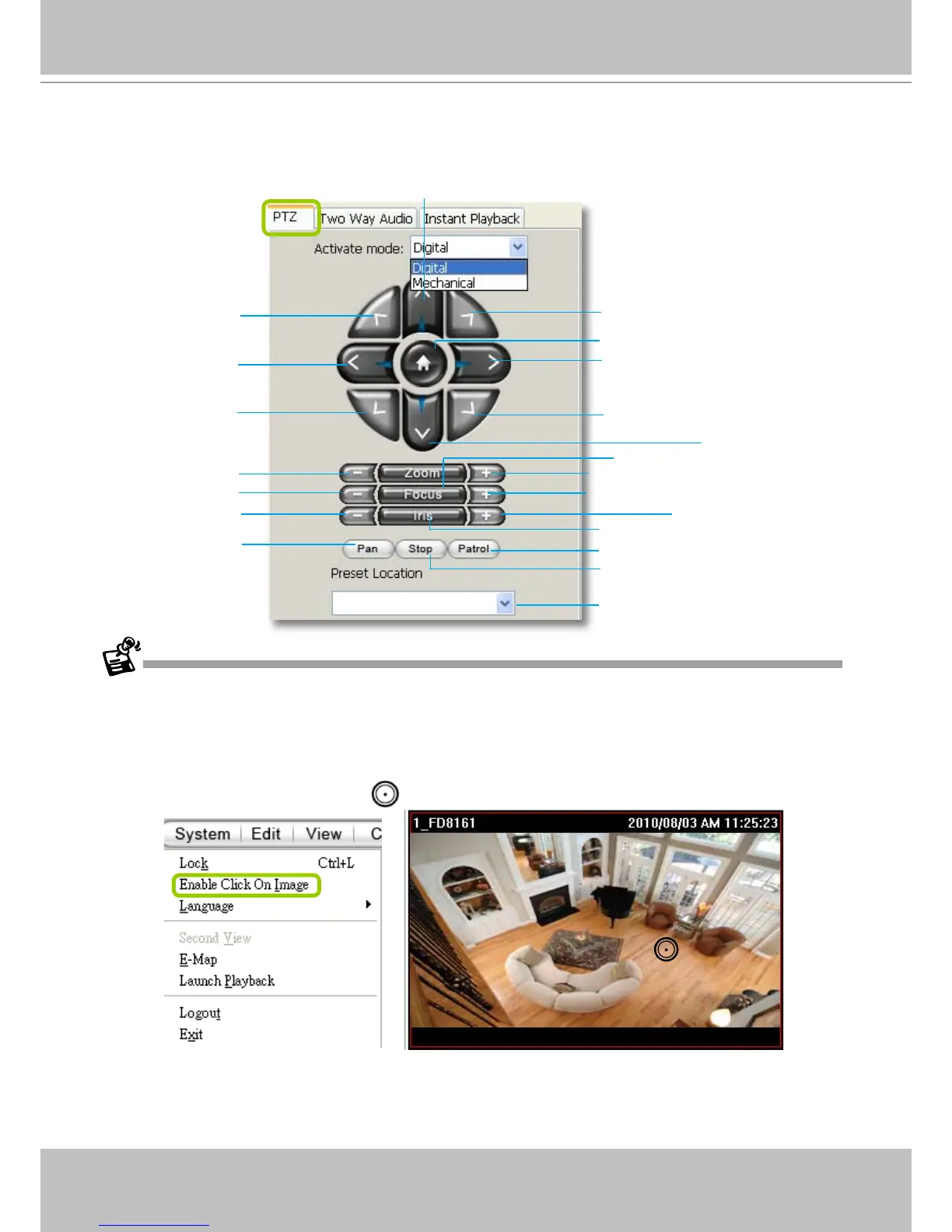 Click System > Enable Click On Image to use the mouse for the control of the PTZ and e-PTZ functions in the