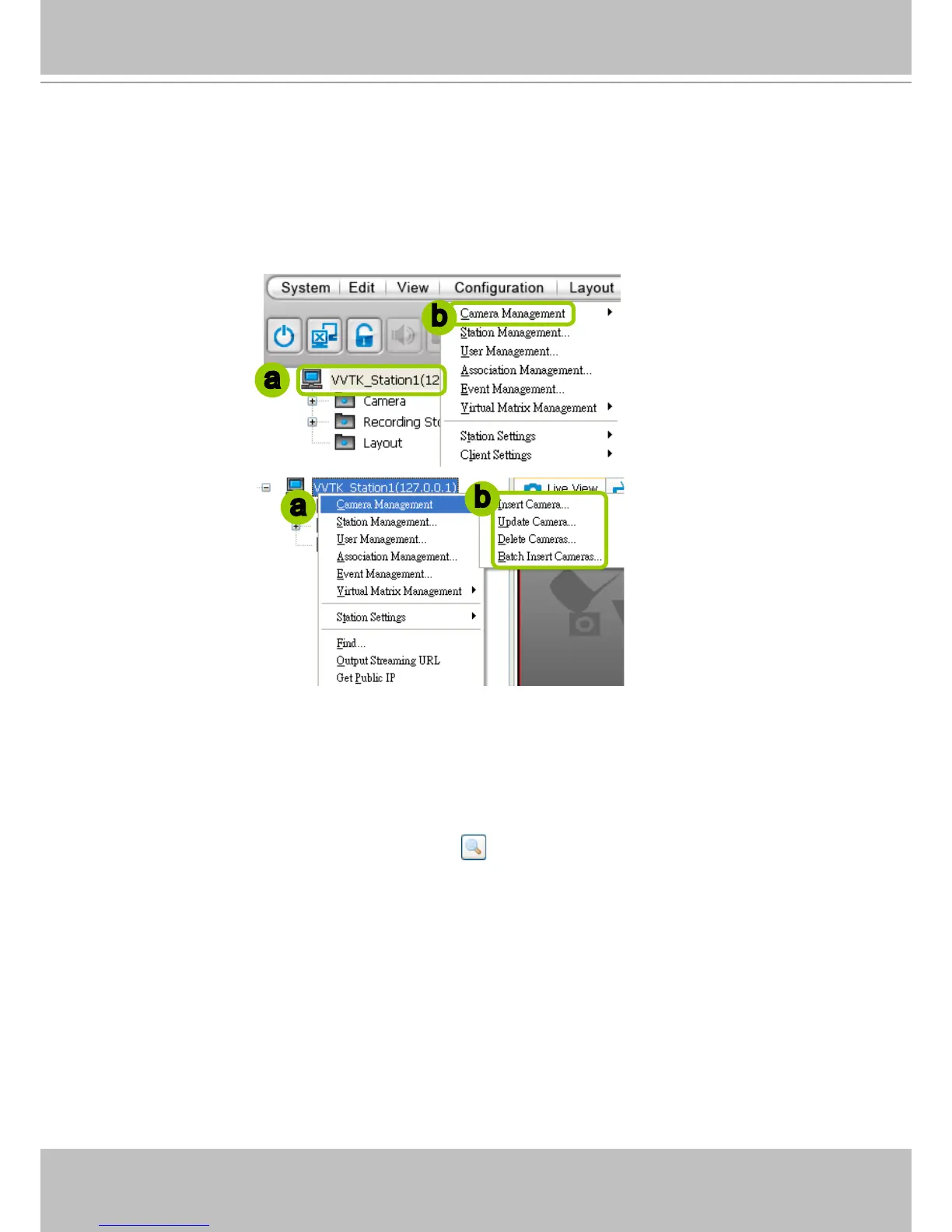 b. Click Conguration > Camera Management on the menu bar (or right-click the station, then select