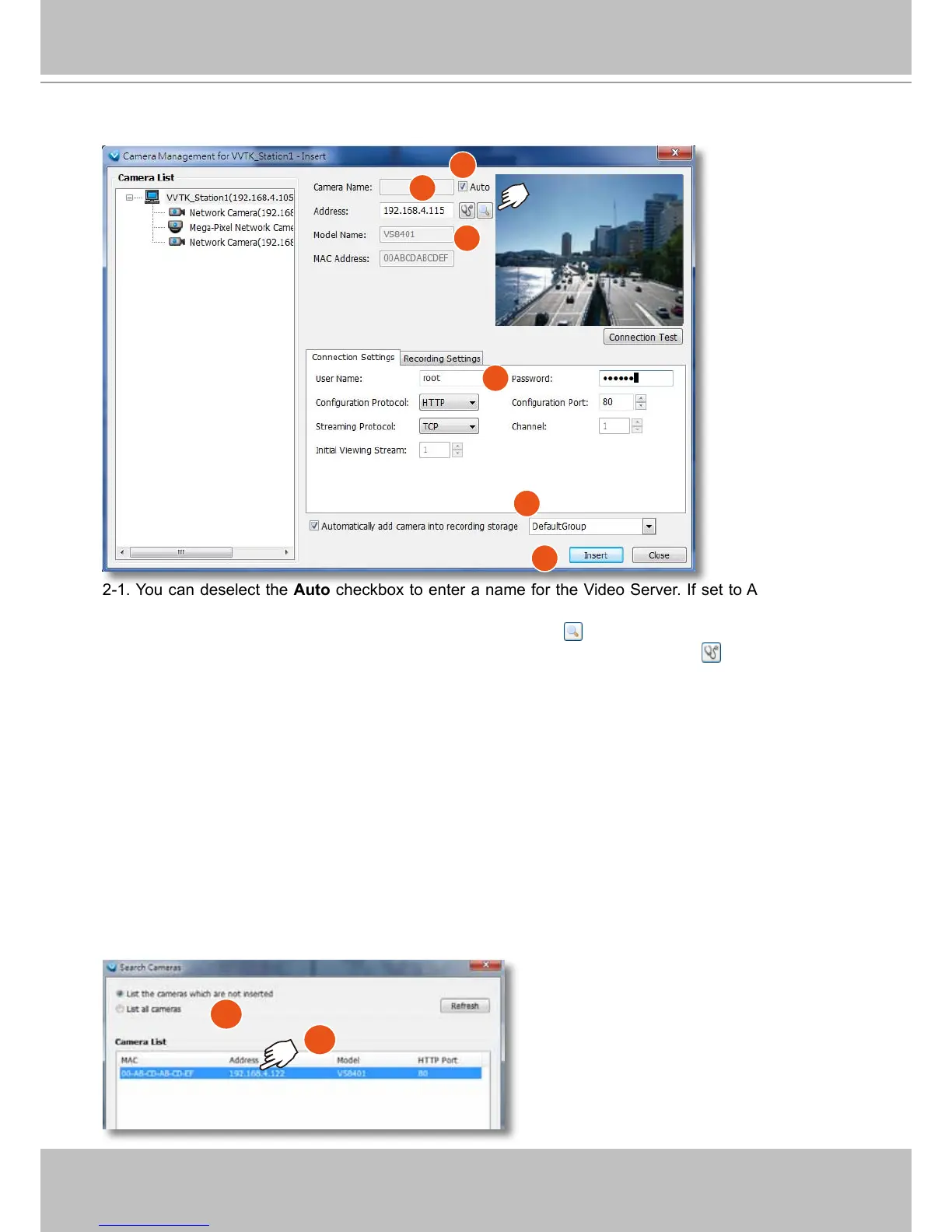 2. See below for the steps to insert a Video Server along with its subordinate cameras.