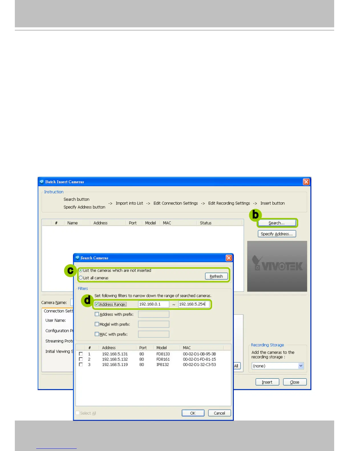 b. The Batch Insert Cameras window will pop up. Then click Search to open the Search Camera