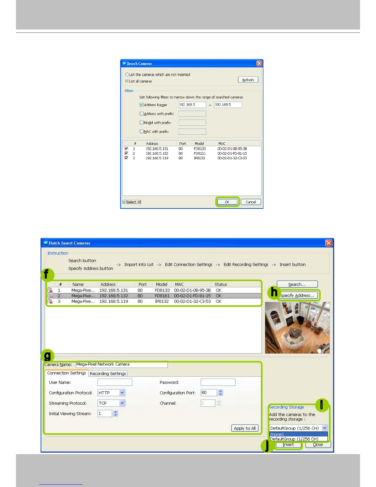 f. The selected cameras will be shown on the batch insert camera list with the camera information and