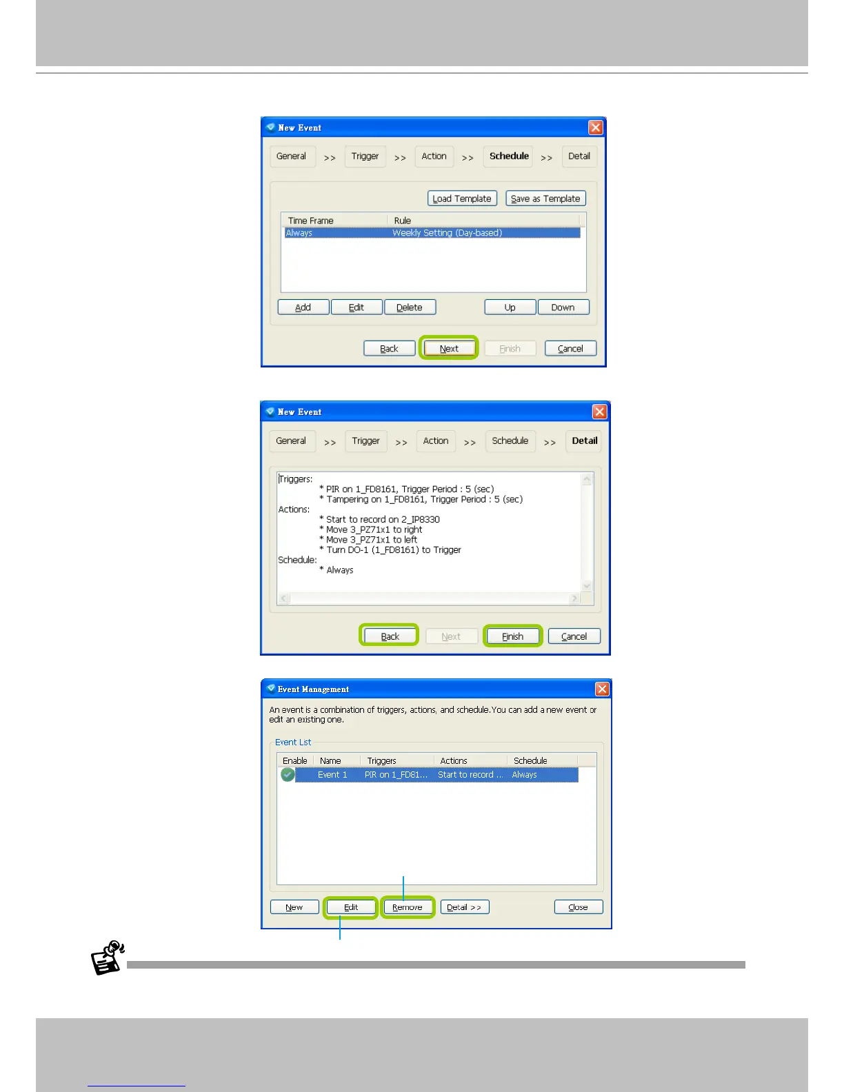 u. Following is the detailed information of the new event setting. You can click Back to modify the event