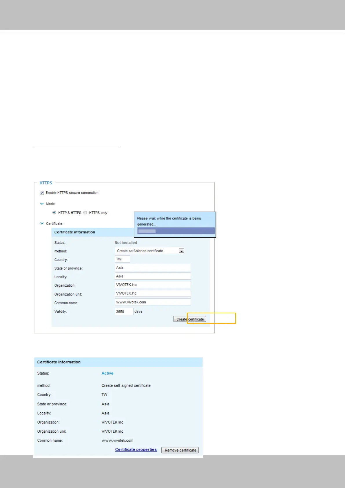Before using HTTPS for communication with the Network Camera, a Certicate must be created