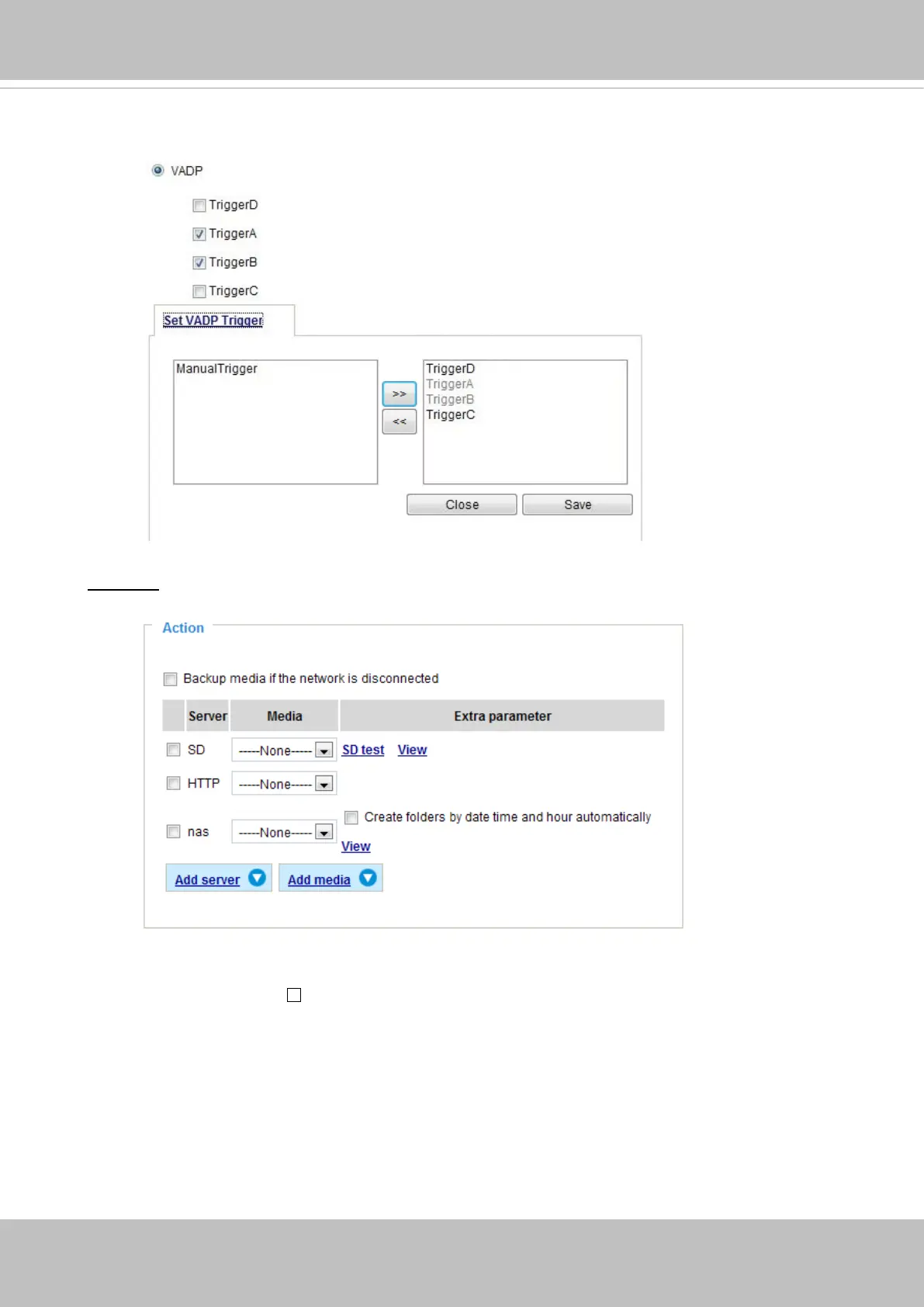 Dene the actions to be performed by the Network Camera when a trigger is activated.