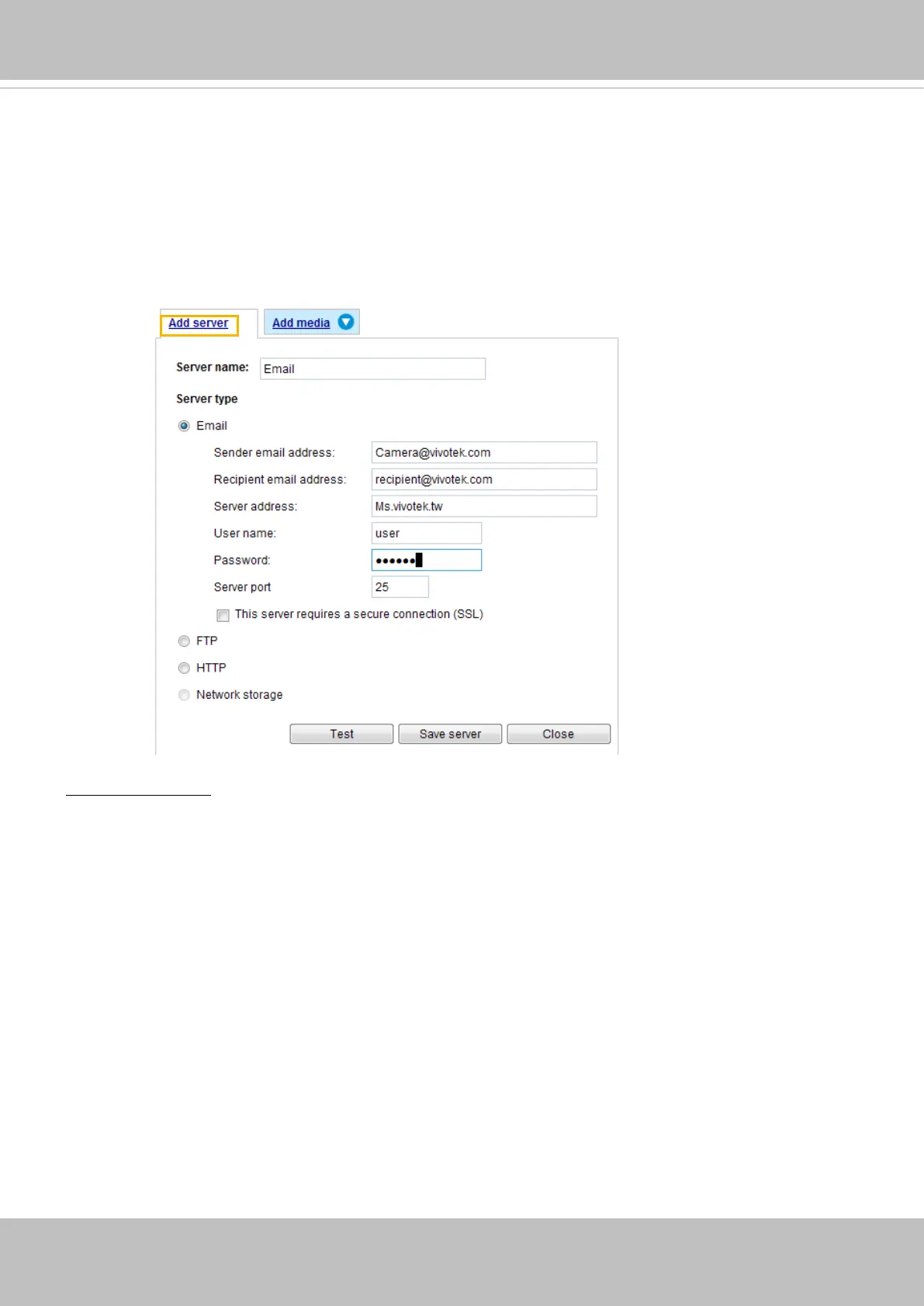 It is necessary to congure the server and media settings so that the Network Camera will know what