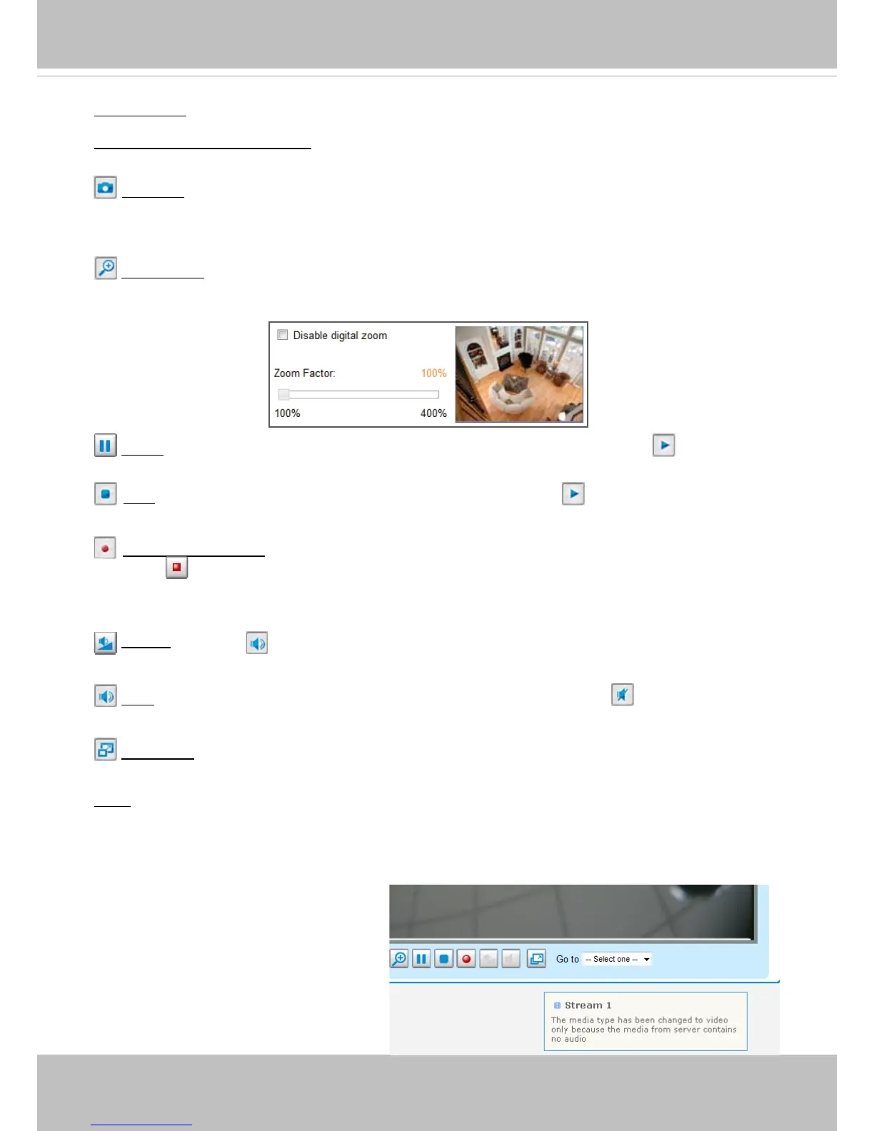 Stop: Stop the transmission of the streaming media. Click the Resume button to continue