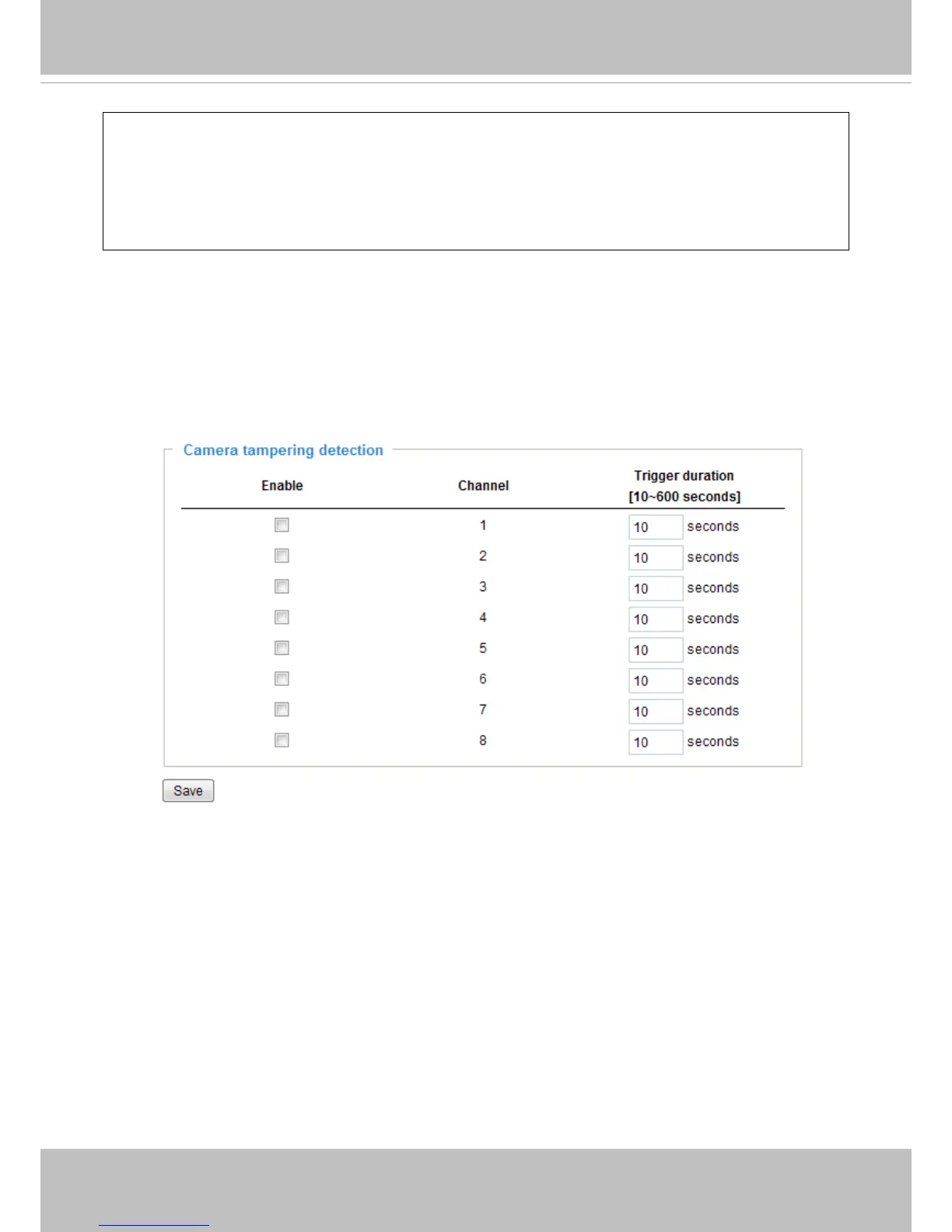 2. Enter the trigger duration. (10 sec. ~ 10 min.) The alarm will be triggered only when the tampering