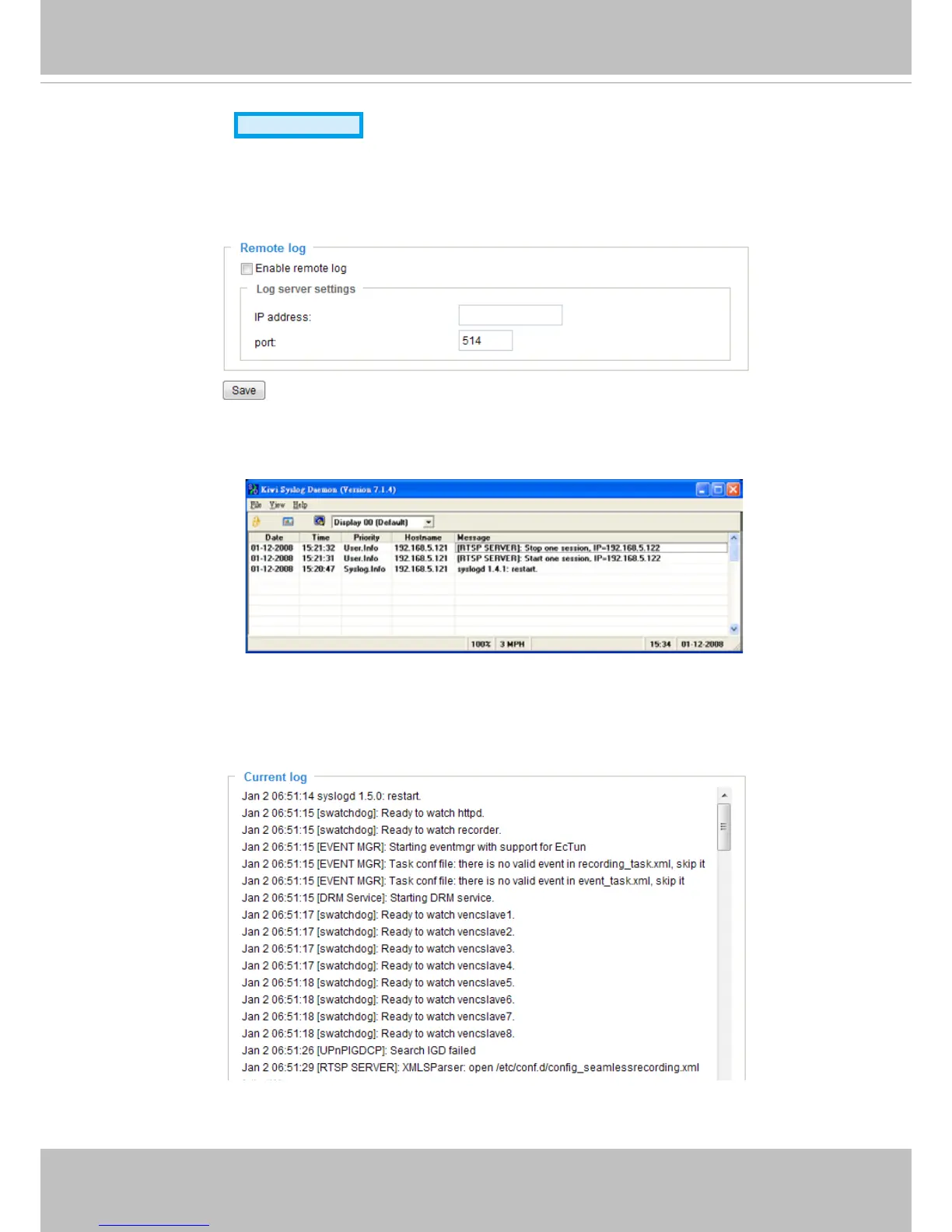 messages from the video server. An example is Kiwi Syslog Daemon. Visit http://www.kiwisyslog.com/