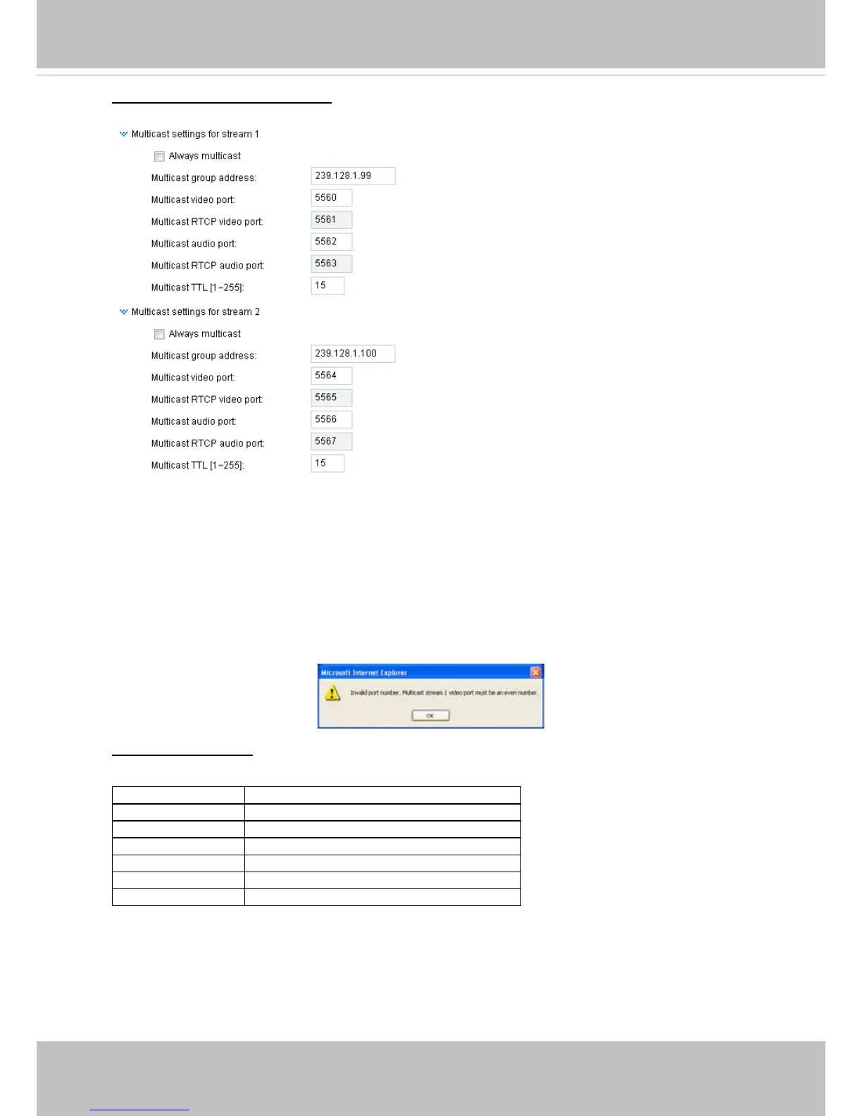 Multicast settings for stream 1 ~ 2: Click the items to display the detailed conguration information.