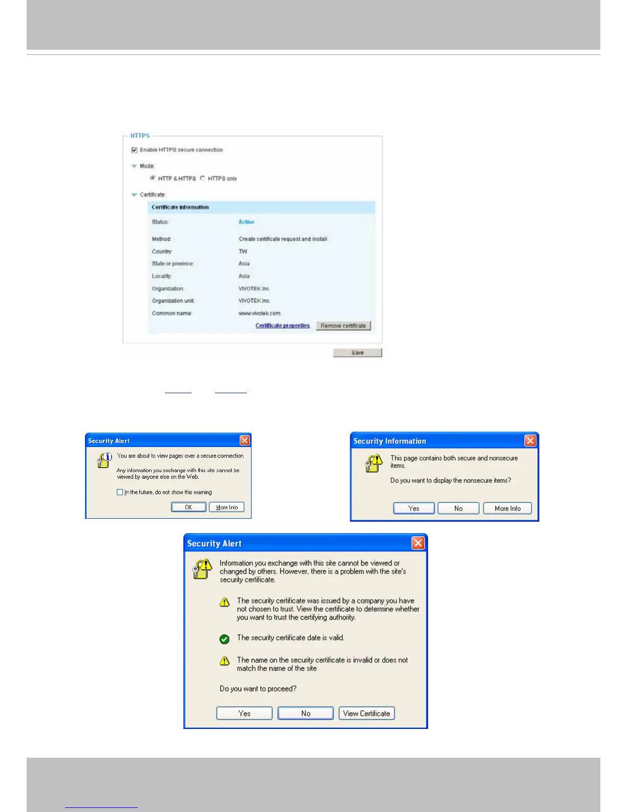 Security Alert dialogs will pop up. Click OK or Yes to enable HTTPS.