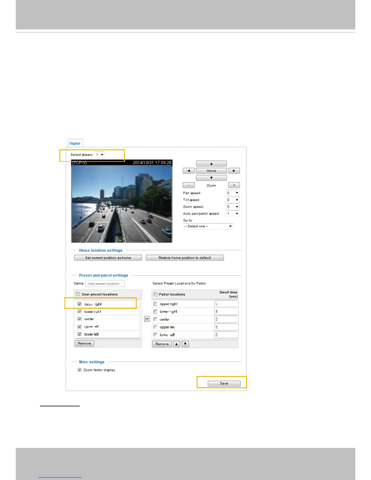 Select Stream: Select stream #1 to set up the e-PTZ control. Please note that each stream can possess