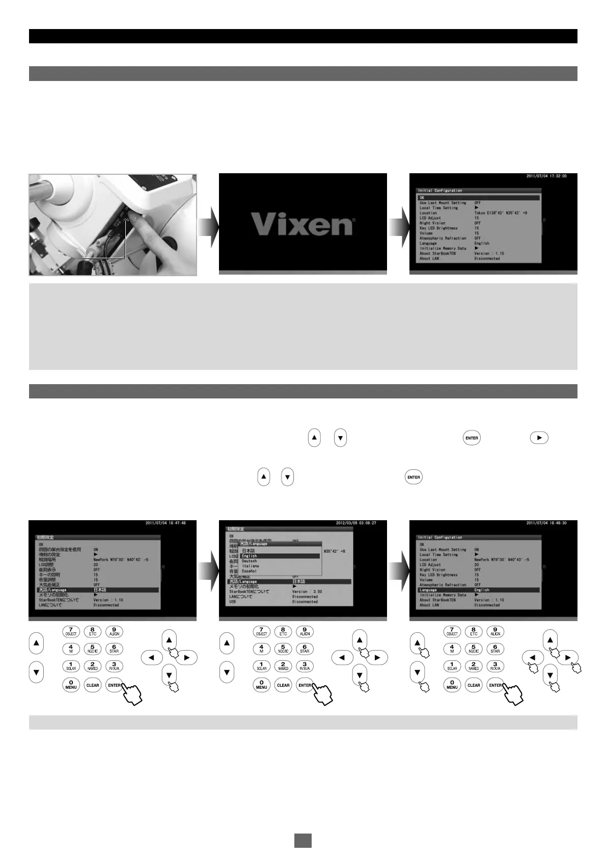 In the “Initial Configuration” menu, choose “言語/Language” with the _ or direction key and press the key (or the key) to