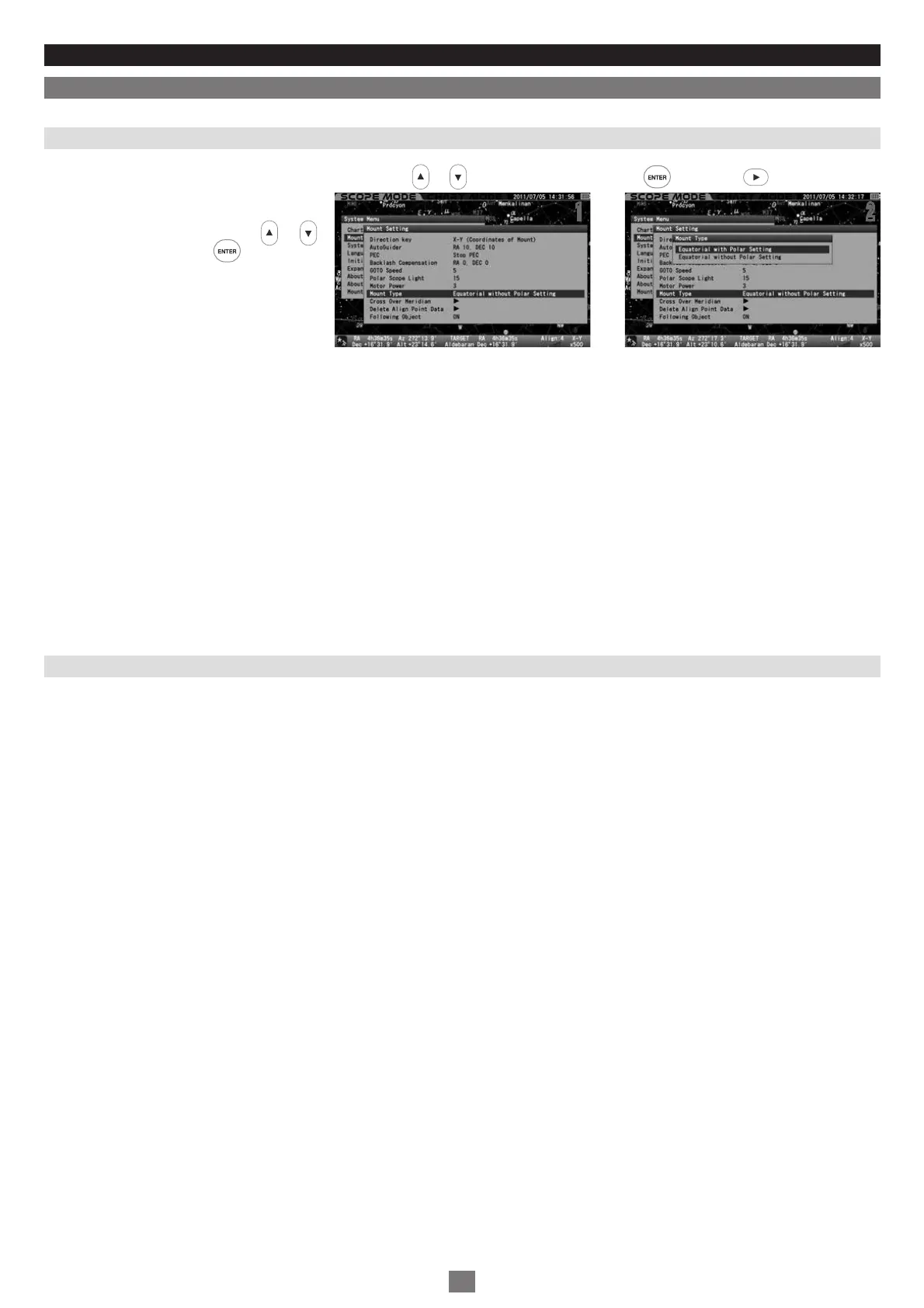 In the “Mount Setting” menu, choose “Mount Type with the or direction key and press the key (or the key) to call up the